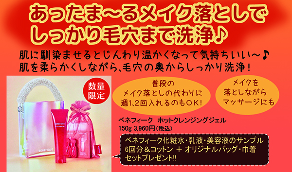 ホットクレンジングご購入で、ベネフィークローション・エマルジョン・美容液のサンプル6回分&コットン+オリジナルバッグ・巾着セットプレゼント!!