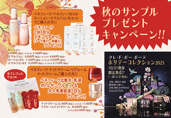 ●ベネフィーク/ベネフィークEXのローション・エマルジョンをセットでご購入の方に「ベネフィーク2泊3日分スキンケアセット」(洗顔・メイク落とし入り)プレゼント!!