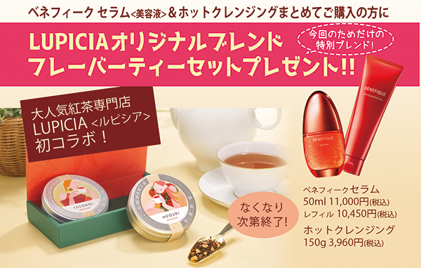 ベネフィークが大人気紅茶専門店ルピシアと初コラボ!このコラボのためだけのオリジナルブレンドティー2種セットを、対象商品をまとめてお買い上げの方にプレゼント!!